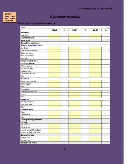 • meglévő vállalkozás esetén: az elmúlt három év mérleg és eredménykimutatása, kölcsön(ök) bemutatása, személyjellegű költségek bemutatása, adófizetési kötelezettségek, nyitó és zárómérleg valamint eredménykimutatás egy-öt évre, készpénzforgalmi előrejelzés havi bontásban egy-három évre,
